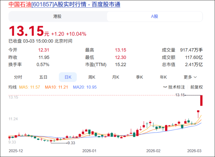 继昨日中国石油、中国石化、中国海油历史上首次集体涨停之后,今日“石油三巨头”再次出现强势涨停,与之形成鲜明对比的是,A股三大指数集体下挫,两市逾4700只个股下跌。其中上证综指盘中突破前高,几乎收在日内最低点。