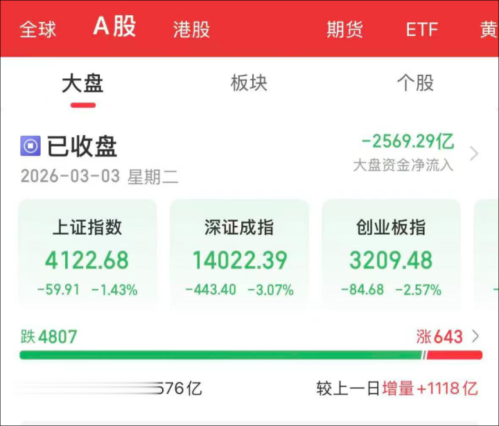 截至今日收盘,沪指跌1.43%,深证成指跌3.07%,创业板指跌2.57%。沪深京三市成交额超过3.1万亿元,较昨日放量逾千亿元。