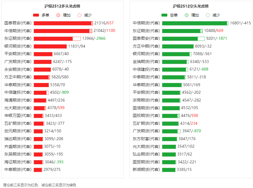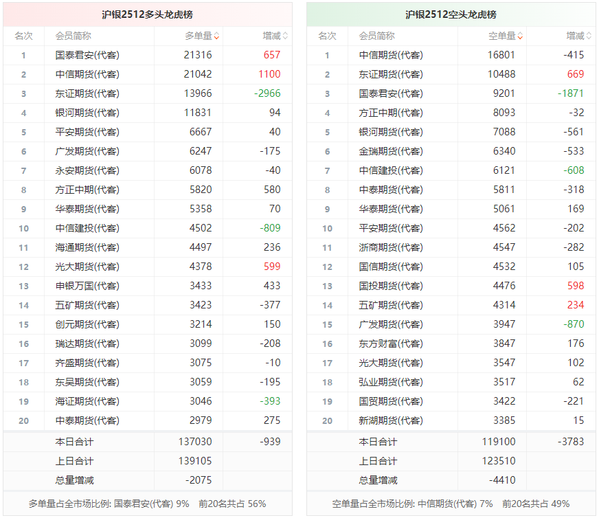 总体而言,沪银2512合约今日减仓上行,多空持仓排名前20席中,多空双方均呈退场态势,多头退场意愿弱于空头。